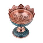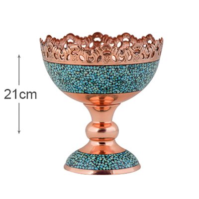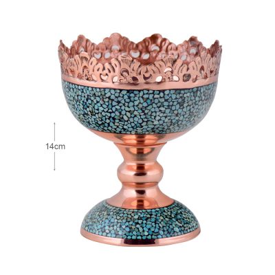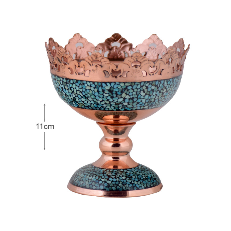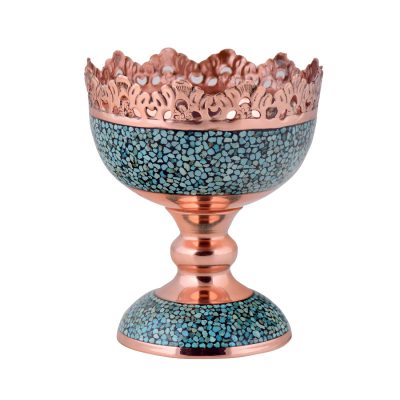آجیل خوری متوسط فیروزه کوب به بصورت شبکه بری ساخته شده است . روی ظرف و همیچنین روی پایه ی آن با سنگ های ریز فیروزه به صورت منظم تزئین شده است.و همچینین قسمت داخلی این ظرف اجیل خوری با طرح های بسیار زیبا، قلم زنی شده است.هنر فیروزه کوبی با سابقه بیش از 70 سال در شهر اصفهان زیباترین ظروف صنایع دستی با هنر فیروزه کوبی ساخته می شود. این صنایع دستی را از هر فروشگاهی که ارائه دهنده ی ان باشد می توانید تهیه کنید اما ما به شما توصیه می کنیم از جاهایی که محصول مرغوب و با کیفیت تولید و ارائه می کنند خرید کنید.جنس اصلی این ظرف مس اعلا بوده که پس از ساخت شکل کلی ظرف، ظرف آجیل خوری مسی با تکه‌ سنگ های فیروزه با فرم موزاییک و با کمترین فاصله در کنار هم چسباده می‌شوند.سنگ های استفاده شده در تمام ظروف فیروزه کوبی فروشگاه هنرلوکس، فیروزه مرغوب نیشابور می باشد.