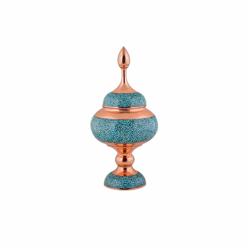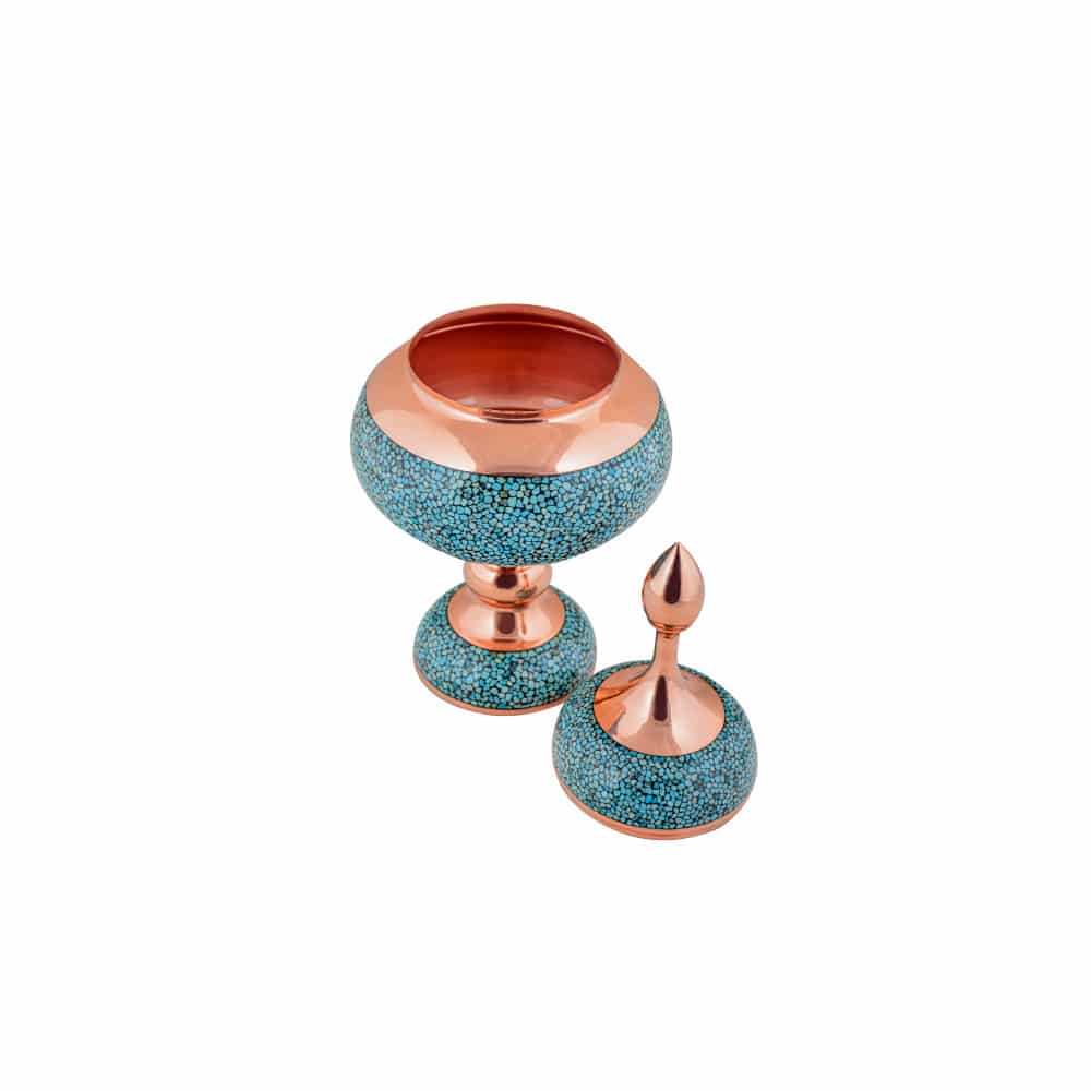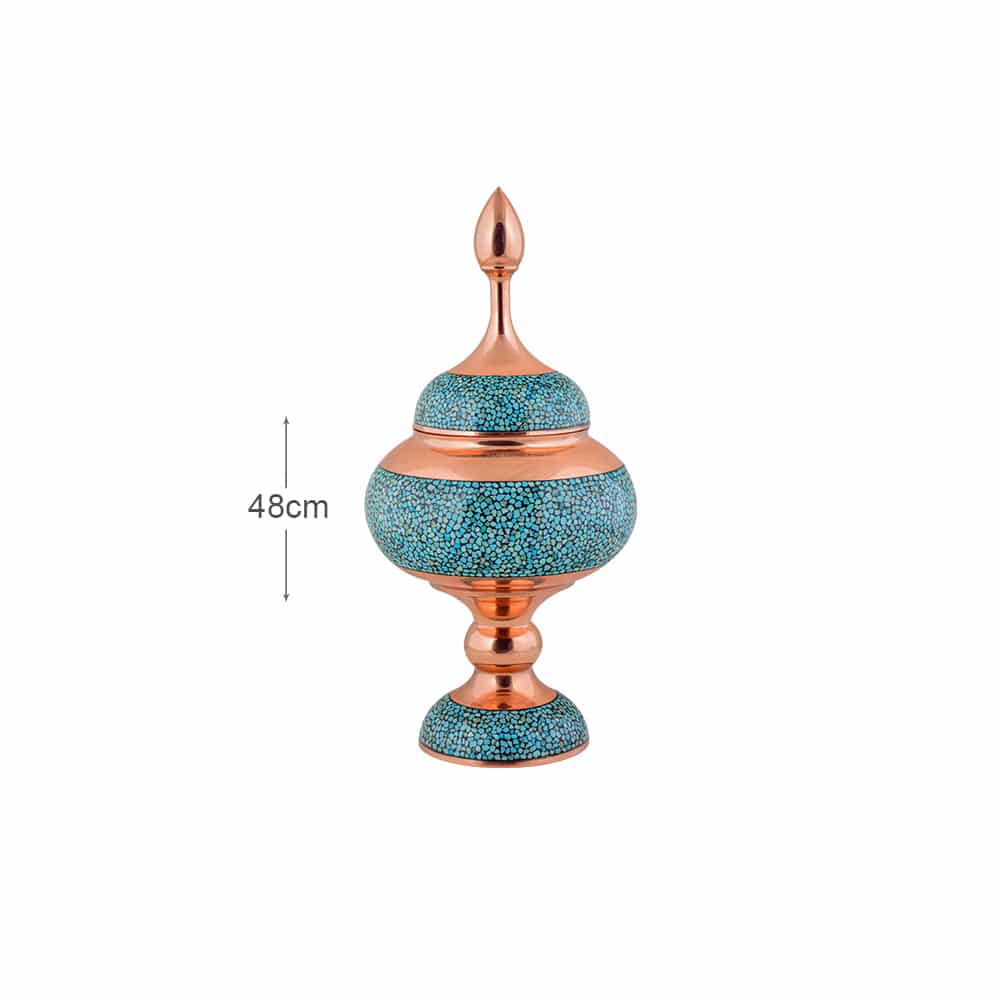 سنگاب فیروزه با وزن 1400 گرم میتواند در منزل یا محل کار شما نمایی از هنر ایرانی را به همراه آورد.ابعاد 39 سانت می باشد. فیروزه فسفات آبدار طبیعی آلومینیم است که دردستگاه کج وجهی متبلور میشود، به عنوان جواهر به کار میرود و باید گفت یک کانی کمیاب و ارزشمند به رنگ های طیف فیروزه ای آبی روشن تا سبزیافت می شود و فیروزه کوبی یکی از معدود رشته های صنایع دستی است که زیبایی و گیرایی یک فرآورده ی خوب صنایع دستی را با خود دارد. رنگ فیروزه ای سنگ های کار شده در مس، تب و تاب طوفانی دل را به آرامش میرساند. و نگاه کردن به این آبیِ آرامش بخشِ فیروزه از قدیم بسیار سفارش شده است. و هنر اصیل ایرانی با قرار دادن این سنگ بر روی مس حاصل کار را رویایی و کامل کرده است.شکلات خوری فیروزه کوب برای کسانی که قصد خرید صنایع دستی امضا دار را دارند،یک محصول منحصر به فرد است.دارای امضا میباشد،اصالت سنگ نیشابور دارد که بهمراه شناسنامه ارائه میشود. شکلات خوری فیروزه کاری 30 سانتی متری-مجموعه سلام-کد014 از ضمانت نامه ویژه بر خوردار است که دارای 10 سال ضمانت بصورت تعویضی قرار گرفته است.ارتفاع این شکلات خوری فیروزه کوب 39 سانتی متر است که بدنه مسی آن تماما از فلز مس خالص و درجه یک تهیه شده است.سه لایه پوشش داده شده است.درجه کیفیت:A.محصول تولید شده دارای نشان استاندارد ملی ایران می باشد.تکههای سنگ فیروزه به کار رفته در شکلات خوری فیروزه کوب، فیروزه نیشابور و مرغوب هستند.یک صنایع دستی کامل که تمام سنگ های استفاده شده در این محصول توسط دست جایگذاری و چسبانده شدهاند.