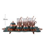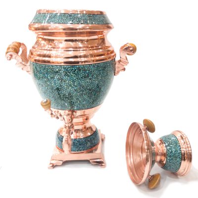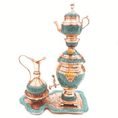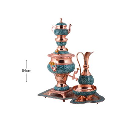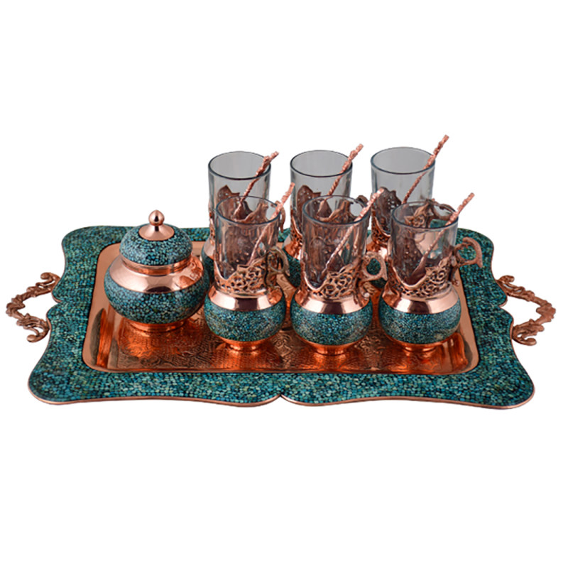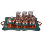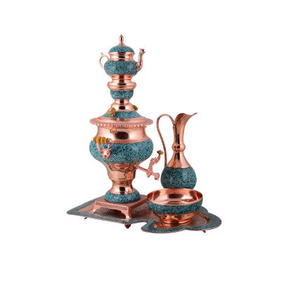 سرویس چای خوری 8 پارچه با بدنه مسی و فیروزه ، با ظاهری خاص و منحصر به فرد ، با لایه محافظی بسیار عالی و مرغوب پلی استر همراه با پایه از تولیدات خلاقانه برند مظفری است که محصولی بسیار زیبا و مناسب برای پذیرایی و تزئین میباشد. کاربرد در همین سرویس چای خوری می توانید مجموعه از هنر اصیل ایرانی را نظاره گر باشید. این سرویس می تواند به سان نگین انگشتر در خانه و بوفه شما بدرخشد و یا هدیه ای درخور عزیزان هنرمند باشد. از گالش های این سرویس می توانید برای پذیرایی استفاده کنید. چیدمان طراحی خاص این سرویس نوعی ویژگی بی زمانی و بی مکانی به آن بخشیده است به این صورت که این سرویس چای خوری نه مختص زمان و دوره خاصی است نه برای مکان منحصر به فردی؛ زیبایی این سرویس چای خوری مسی، نه تنها در هیچ زمان و مکانی قدیمی نخواهد شد که این ویژگی هنر اصیل است، بلکه با گذشت زمان بر ارزش آن نیز افزوده می شود. همچنین در هر فضایی اعم از سنتی یا مدرن این سرویس زیبایی و درخشش خود را حفظ خواهد کرد.