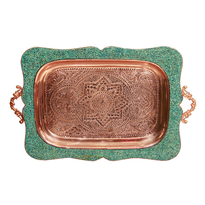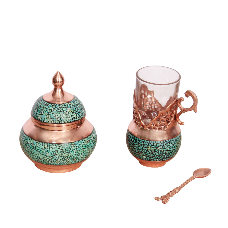 سرویس چای خوری 8 پارچه با بدنه مسی و فیروزه ، با ظاهری خاص و منحصر به فرد ، با لایه محافظی بسیار عالی و مرغوب پلی استر همراه با پایه از تولیدات خلاقانه برند مظفری است که محصولی بسیار زیبا و مناسب برای پذیرایی و تزئین میباشد. کاربرد در همین سرویس چای خوری می توانید مجموعه از هنر اصیل ایرانی را نظاره گر باشید. این سرویس می تواند به سان نگین انگشتر در خانه و بوفه شما بدرخشد و یا هدیه ای درخور عزیزان هنرمند باشد. تمامی محصولات با امضای استاد مظفری به فروش می رسند. از گالش های این سرویس می توانید برای پذیرایی استفاده کنید. چیدمان طراحی خاص این سرویس نوعی ویژگی بی زمانی و بی مکانی به آن بخشیده است به این صورت که این سرویس چای خوری نه مختص زمان و دوره خاصی است نه برای مکان منحصر به فردی؛ زیبایی این سرویس چای خوری مسی، نه تنها در هیچ زمان و مکانی قدیمی نخواهد شد که این ویژگی هنر اصیل است، بلکه با گذشت زمان بر ارزش آن نیز افزوده می شود. همچنین در هر فضایی اعم از سنتی یا مدرن این سرویس زیبایی و درخشش خود را حفظ خواهد کرد.